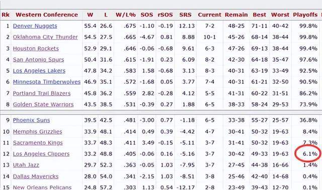 根據(jù)美媒網(wǎng)站Basketball Reference的季后賽晉級(jí)概率統(tǒng)計(jì),目前快船只剩下6.1%的機(jī)會(huì)打進(jìn)季后賽,排名西部倒數(shù)第四,僅僅勝過1.4%的爵士、0.4%的獨(dú)行俠、0.1%的鵜鶘三隊(duì)。
